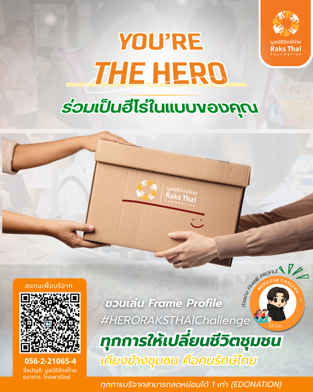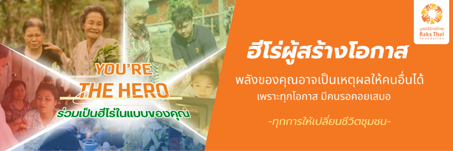 ทุกงานของรักษ์ไทยได้ทำ เกิดขึ้นจากการร่วมมือของเจ้าหน้าที่ในพื้นที่และผู้บริจาค พลังของผู้บริจาคทำให้เรายืนเคียงข้างชุมชน ช่วยให้ชุมชน มีโอกาสสร้างอนาคตที่มั่นคงขึ้น ด้วยตัวของเขาเอง ร่วมเป็นฮีโร่วันนี้ เพื่อส่งต่อโอกาสที่ยั่งยืนให้ชุมชนไทย
